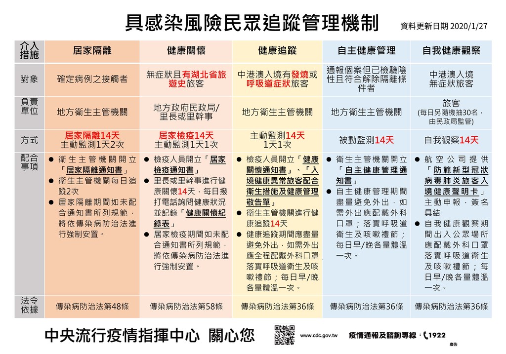 ▲因應武漢肺炎,居家隔離等具感染風險民眾追蹤管理機制表(點圖可放大)。(圖/中央流行疫情指揮中心提供)