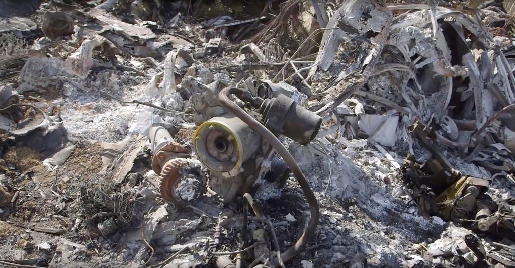 ▲墜機現場零件、殘骸大多嚴重損害,被燒得灰白。(圖/路透)