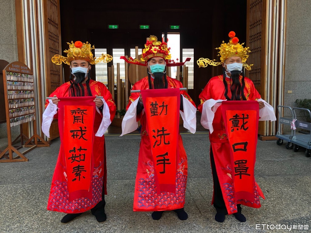 新春團拜後,志工來到一樓中庭,各自就定點定位,來為會眾賀新春,宣導防炎,三位財神爺手執紅布條,寫上「齋戒茹素」、「勤洗手」、「戴口罩」,靜思鼓隊,擊出陣陣鼓聲,年味中有溫馨的義賣。
