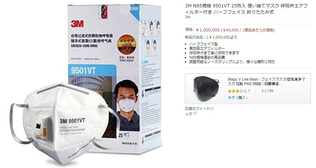 日本亞馬遜網站就出現有商品頁面標示一盒25入的3M N95規格口罩要價100萬日幣(約新台幣30萬),平均一個口罩約日幣4萬元,其他口罩相關商品,也出現2組共60入日幣售價1萬500元(約新台幣2940元),或2組共60入日幣售價1萬5800元(約新台幣4400元)的情況。