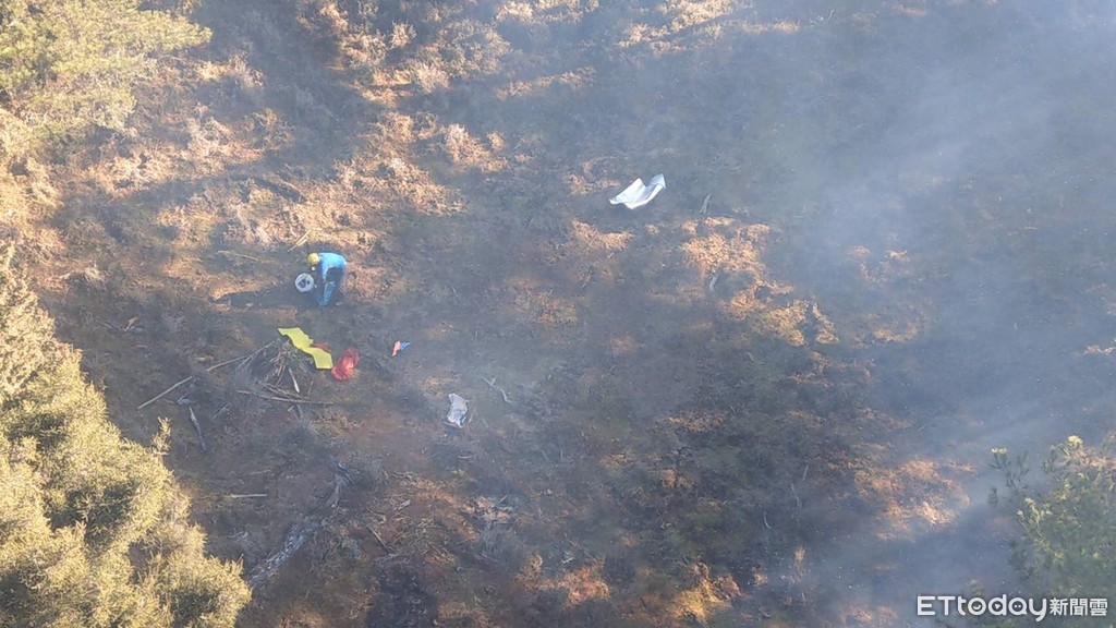 ▲山屋東邊稜線有名身穿藍色上衣、頭戴黃色頭盔的男子,揮舞白旗、放狼煙及反光等求救訊號,經家屬比對確認為何男無誤。(圖/記者王兆麟翻攝,下同)