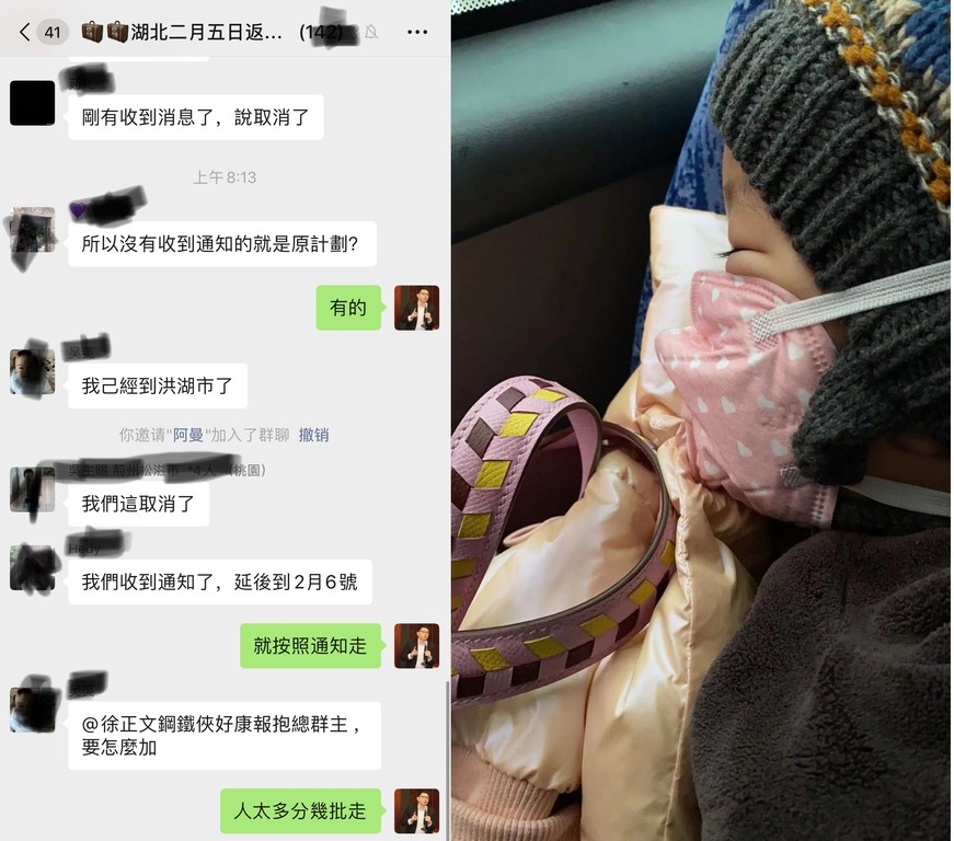 ▲第二批滯留武漢返台民眾表示,臨時收到訊息稱包機改到6日執行,有媽媽貼出小孩趕車畫面表示無奈。(圖/徐正文提供)