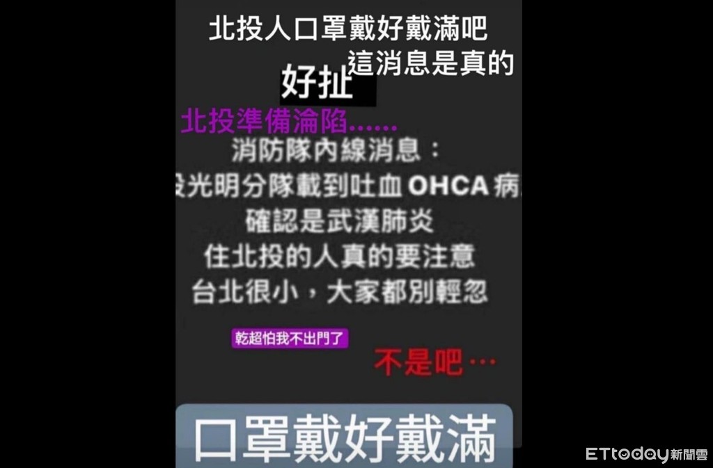 北投分局指出,在網路巡邏時發現酆女在網路上張貼北投準備淪陷,更指出「消防隊內線消息:北投光明分隊載到吐血病患,確認是武漢肺炎」,要住北投的人要注意,並強調口罩「戴好戴滿」。