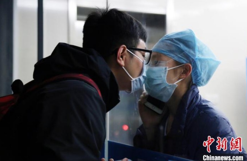 ▲陳穎與男友僅能隔窗親吻。(圖/翻攝自《中新社》)