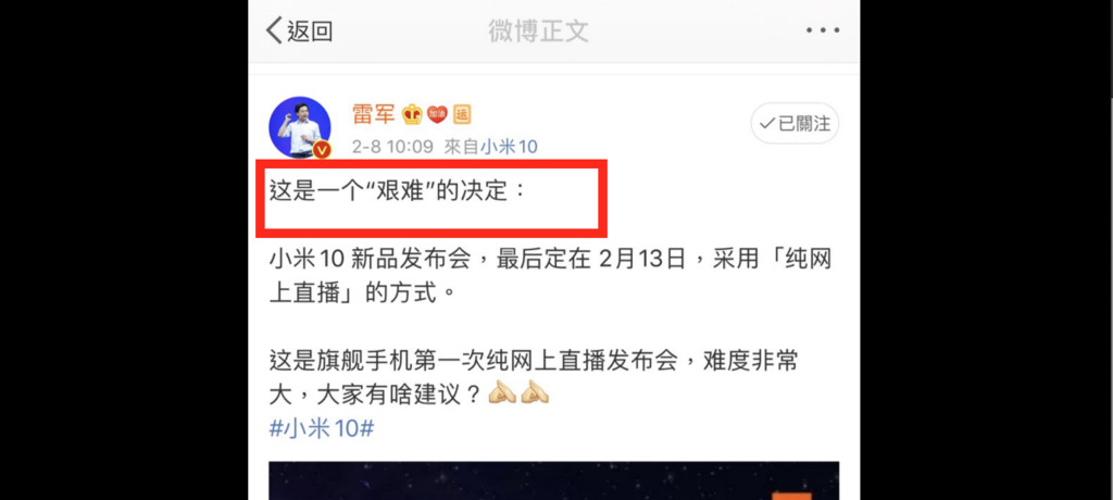 8日上午10點09分,雷軍在自己的微博發出訊息,一開始就先講這是一個艱難的決定:「小米10新品發布會,最後定在2月13日採用純網上直播方式,這是旗艦手機第一次純網上直播發布會」,雷軍也表示難度非常大,詢問大家有什麼建議。