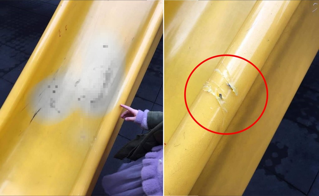 照片中的溜滑梯還留下斑斑血跡,相當怵目驚心,更讓人擔心的是,刀片如果沾有病毒或細菌,恐怕不只害人受傷,還有可能染上疾病。