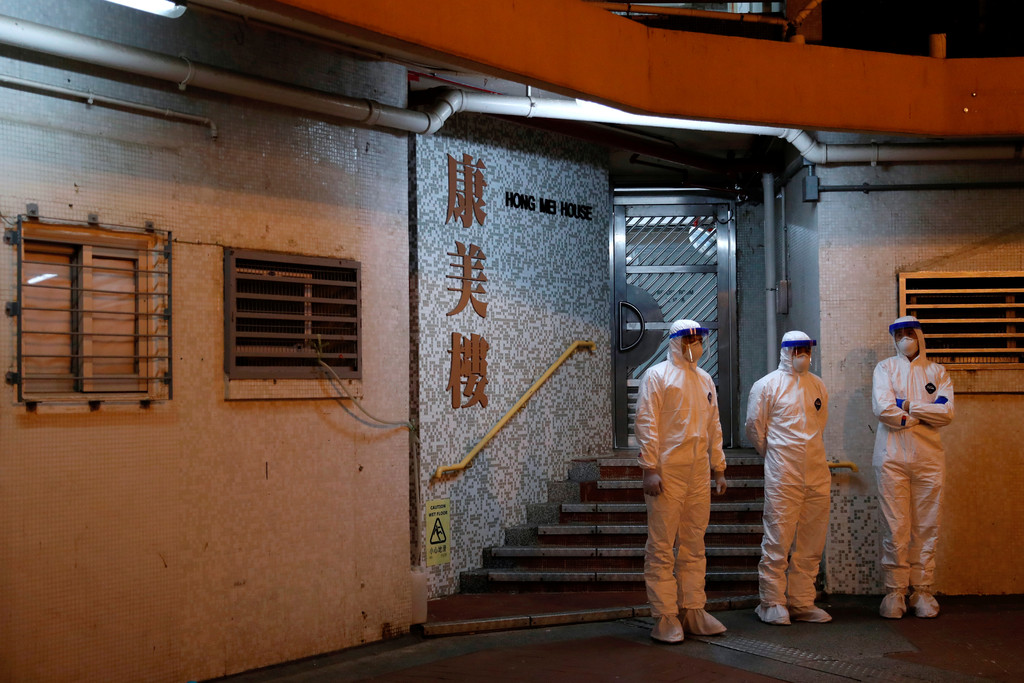 ▲康美樓凌晨緊急撤離居民,防疫人員在外戒備。(圖/路透社,下同。)