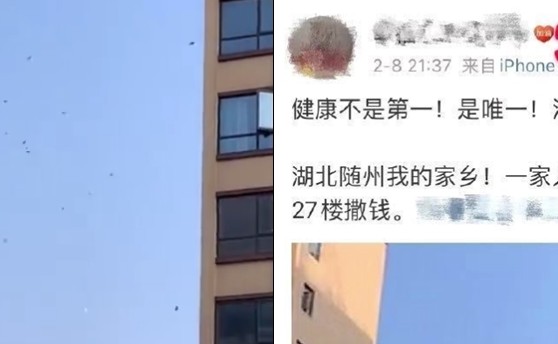 微博網友「幸福小米蟲冷豔」日前貼出一段影片表示,「健康不是第一!是唯一!沒了健康要錢有啥用!」她表示,一家人全部感染武漢肺炎,因此絕望之下,便在元宵節當天從27樓撒下紙鈔。