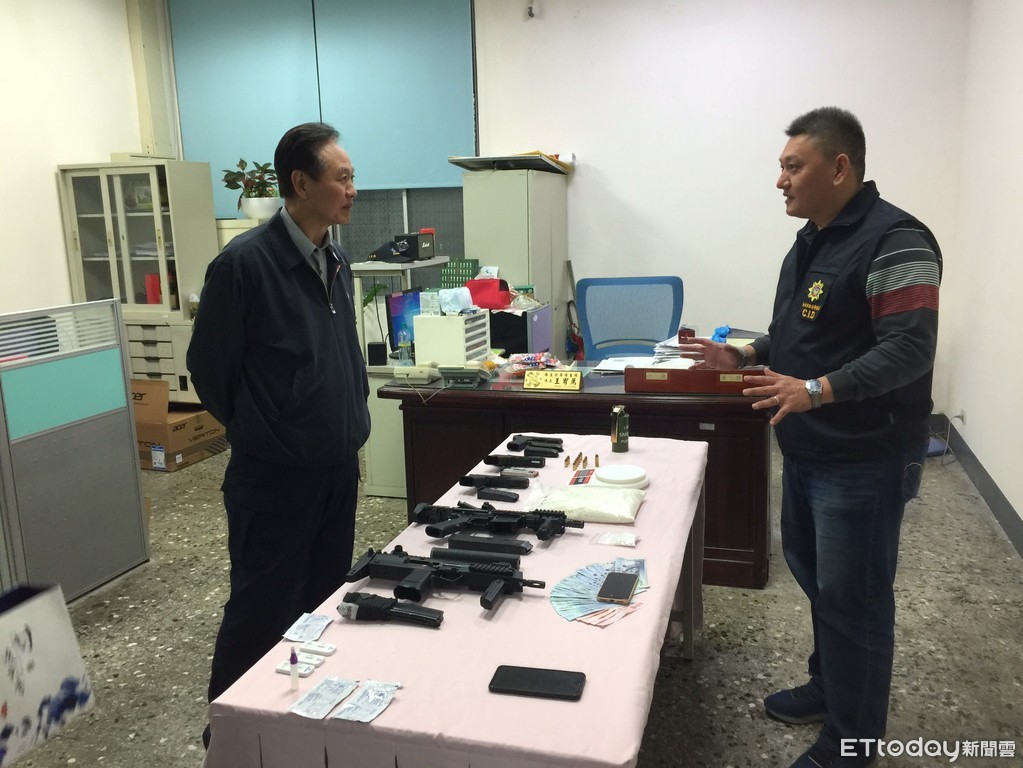 ▲台南市警麻豆分局偵查隊,據報前往新北市三重區1家手機零件通訊行,查獲長短槍及毒品一批,市警局長周幼偉前往鼓勵員警。(圖/記者林悅翻攝,下同)