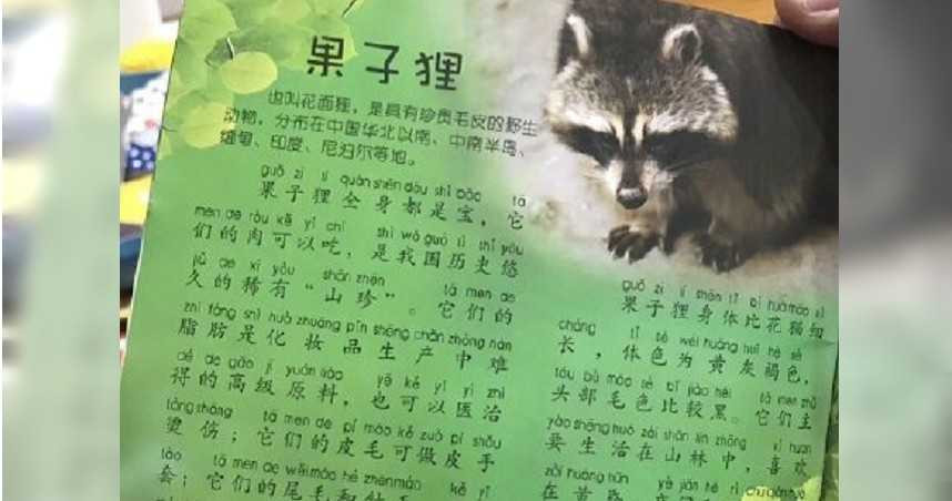 日前有網友發現,武漢一本童書傳遞錯誤資訊,聲稱果子狸可以食用,而且還是「稀有山珍」,誤植錯誤內容引發一片討論,因此,有人聯想到近日因濫殺野生動物演變成疫情的新型冠狀肺炎(俗稱武漢肺炎)後,不禁感嘆:「疫情源地是武漢,果然有跡可循。」而出版社事後也做出回應,表示已全面下架該書。