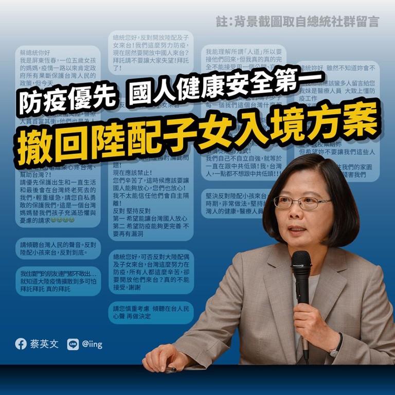針對中央流行疫情指揮中心宣布撤回陸配子女入境方案,引來反彈聲浪,總統蔡英文12日在臉書發文表示,「非常時期,防堵疫情是我們最優先的考量,請大家放心。」