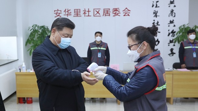 大陸國家主席習近平10日戴著口罩現身,深入北京視察防疫工作,其中「五張照片」12日由官方公布,在網路瘋傳,他走進人群中閒話家常,喊話「非常時期就不握手了!」還關心菜價怎麼樣。中共中央政治局常務委員會12日會議中,他也發表了重要談話,強調「當前疫情防控工作到了最吃勁的關鍵階段」。