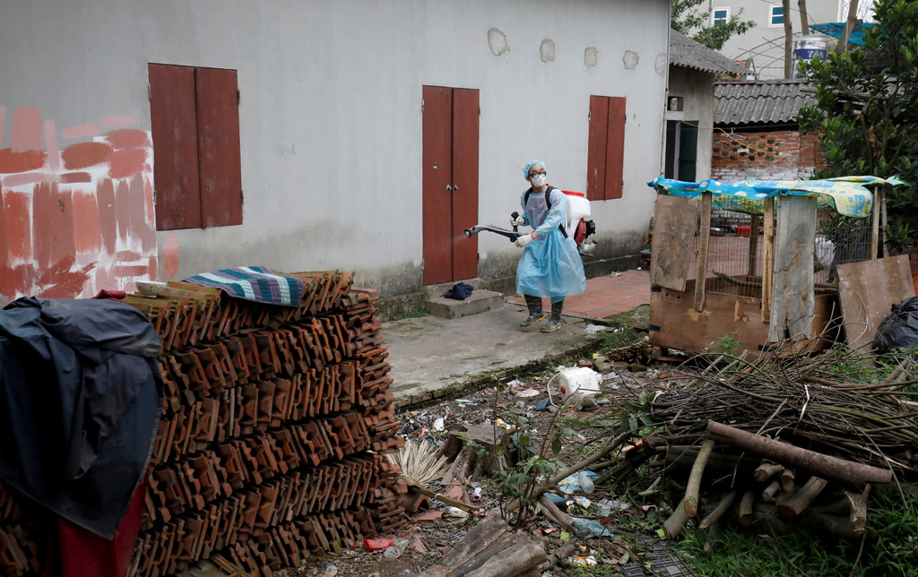 ▲越南北部永福省一名醫療人員進行消毒。(圖/路透)