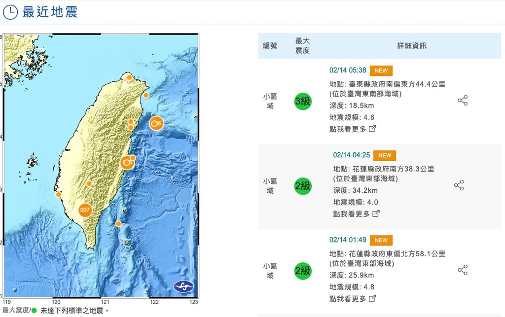 14日凌晨5點38分台東縣發生4.6有感地震,震央在臺東縣政府南偏東方 44.4 公里 ,位於臺灣東南部海域,深度18.5公里,各地最大震度為台東縣3級;屏東、花蓮、高雄1級。