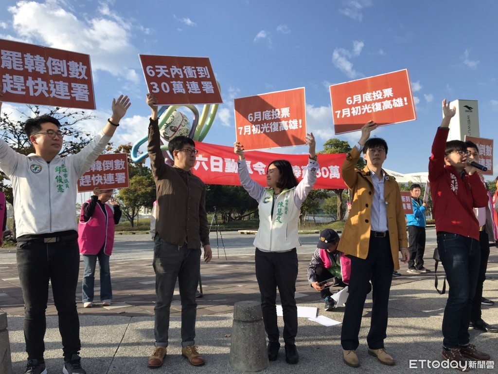 ▼罷韓團體舉牌喊出「6月底投票,7月初光復高雄」的口號。(圖/記者許宥孺翻攝)