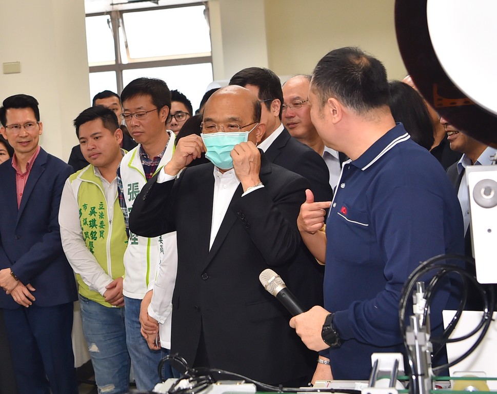 因應新冠肺炎,行政院長蘇貞昌14日視察新北市鶯歌權和機械的口罩設備生產新機組。蘇貞昌表示,確定政府購置的60部機組順利製造,15日首批機台會上線,在政府與民間合作下,原本半年才能交機,現在縮短至1個月內,屆時我國口罩1日產量能達千萬片,成為口罩第2大生產國。