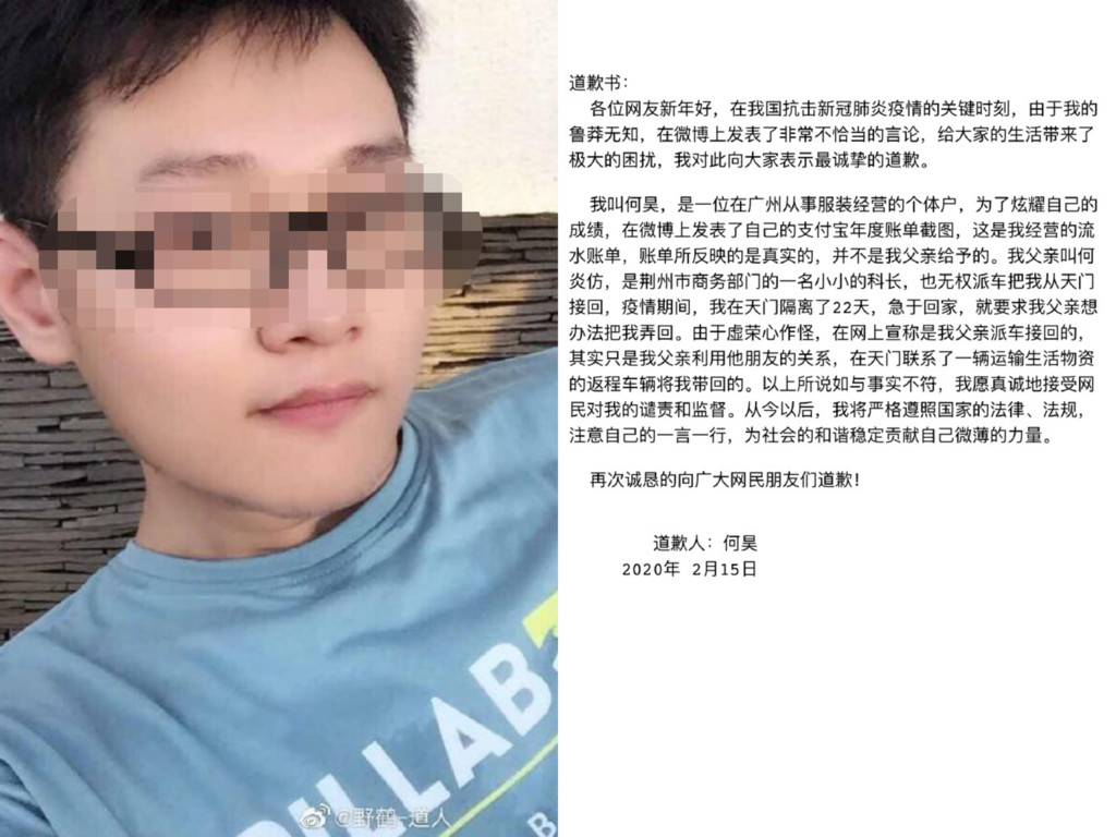 「你爹可能要大意失荊州了」的話題在微博掀起旋風,而事件起源於一位名叫何昊的男子,14日在微博發文,在湖北全省封路的情況下,自己通過「當官的」父親關係,從天門回到荊州。消息傳出後愈演愈烈,網友紛紛猜測何昊是湖北高官的兒子,但他本人則在道歉書中,揭露了父親的真實身份。
