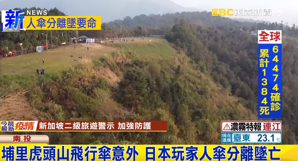 南投縣埔里鎮虎頭山14日下午2時發生一起死亡意外,一名高齡79歲的日籍男子佐藤前往現場挑戰極限運動飛行傘,但佐藤卻在半空中因不明原因「人傘分離」,整個人當場頭部朝下「倒栽蔥」墜地,待被尋獲時已經明顯死亡。目擊民眾也直指,佐藤就在他眼前落下,還在扭動身體不斷掙扎,但整個過程相當快,短短數秒就聽聞「砰」的一聲落地聲響。