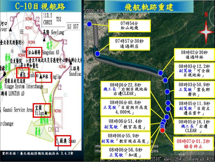 根據調查報告中曝光的對話紀錄,正駕駛先是在當日一早8時3分說了一句「雲長那麼快」,接著,副駕駛報告「目前左邊在雲中」、「右邊CLEAR」,到了6分,機工長報告「右邊目視地面右邊CLEAR」,正駕駛說「目前爬升高度4000呎」。