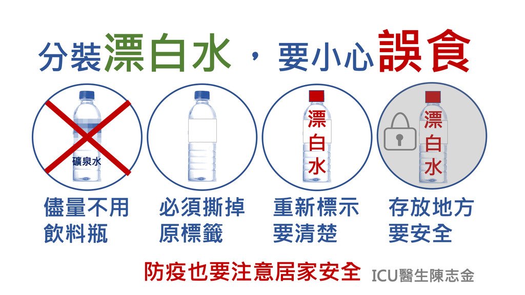 ▲陳志金製作圖表提醒民眾分裝漂白水,要小心誤食。(圖/翻攝「Icu醫生陳志金」臉書)