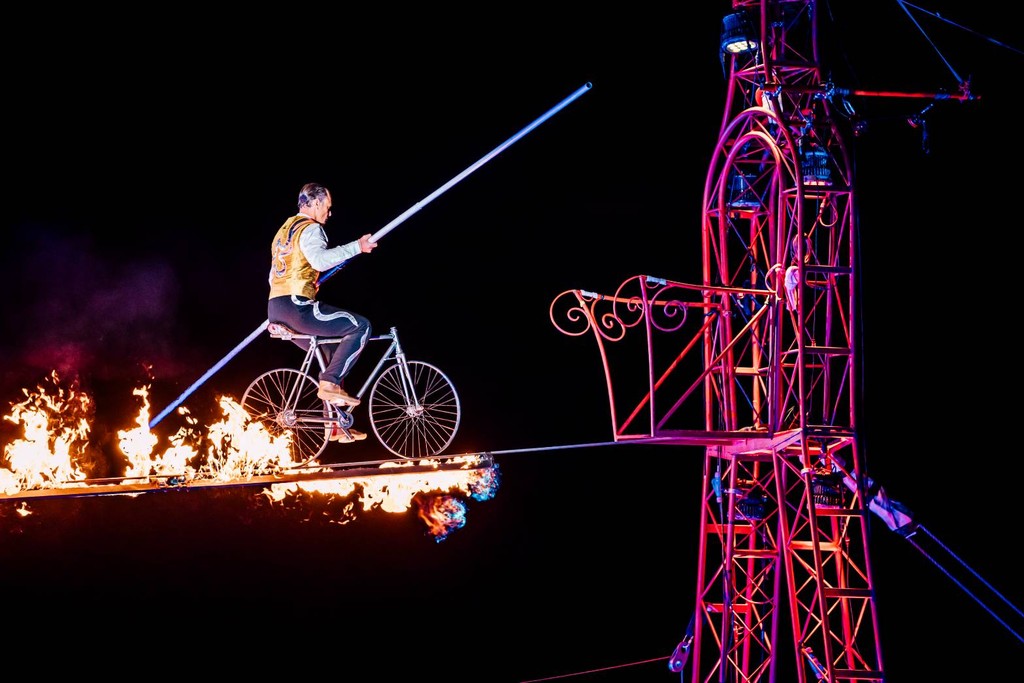 由文化局邀請的「英國珍寶馬戲團」昨晚帶來戶外大型高空特技,高空鋼索演員走在11公尺高的雙塔鋼索上,時而倒立、時而騎腳踏車橫越鋼索,高難度特技搭配戲劇性音樂,緊張又刺激,雖然下著雨,但民眾熱情不減,工作人員也發送雨衣,讓遊客直呼好暖心。