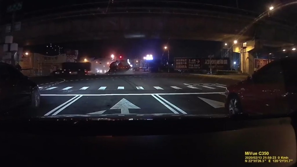 高雄市消防局鳳翔分隊一輛水箱車13日晚間出勤時,於鳳頂路、過埤路口與聯結車發生擦撞,水箱車當場翻覆,造成車內小隊長馮永昌當場遭拋飛、重壓身亡,另還有4名消防員受傷,現仍在救治中。如今行車紀錄器畫面曝光,當時水箱車鳴笛通過路口,但聯結車卻高速駛過、猛力碰撞,水箱車車身瞬間旋轉、翻覆,釀成慘劇。