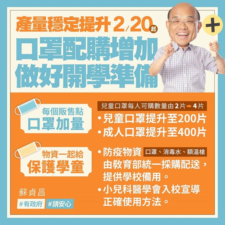 因應新冠肺炎高中以下已延後至25日開學,為讓各學童能有效防疫,蘇貞昌表示,從20日起,兒童口罩部分,從每次2片增加為4片,每間藥房、衛生所每天的兒童口罩配額也從50片提升為200片;成人口罩部分,目前仍維持每次購買2片,不過配額從200片提升到400片,讓每點能夠買到的人次倍增。