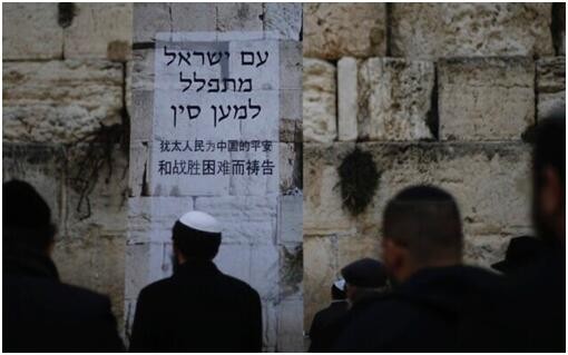 ▲貼在哭牆的告示用簡體中文和希伯來文寫著:「猶太人民為中國的平安和戰勝困難而禱告」。(圖/新浪財經)