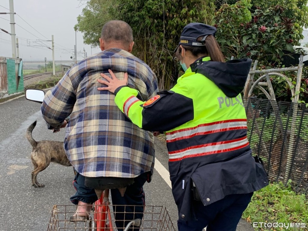 日前花蓮縣警察局玉里分局富里分駐所警員黃怡瑛,執行勤區訪查勤務,行經富里鄉車站街,發現一名長者淋著雨,人坐在三輪腳踏車,神色慌張不知如何是好。黃員見狀立即下車查看關心,經了解劉姓長者年約65歲,因身體不適,雙腳麻痺無法踩踏腳踏板,雨中受困在車水馬龍的道路中央。