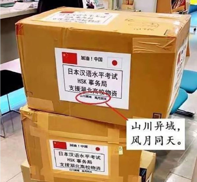 報導也指出,日本運往武漢的物資包裝外頭寫了許多中國詩詞名句,包括「山川異域,風月同天」,意旨雖是不同國家,但大家都在同一片天空下生活,還有「青山一道同雲雨,明月何曾是兩鄉」出自邊塞派詩人王昌齡送別友人的離別詩,以及出自《詩經》的「豈曰無衣,與子同裳」,指的是把戰袍與戰友分享,表達情誼。