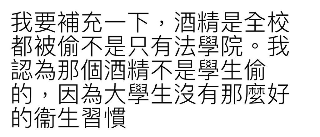東吳法律系疑似因酒精全遭偷走,1名東吳法律系胡姓教授,在臉書上po文,「我要補充一下,酒精是全校都被偷不是只有法學院」,更說到「我認為那個酒精不是學生偷的,因為大學生沒有那麼好的衛生習慣」。
