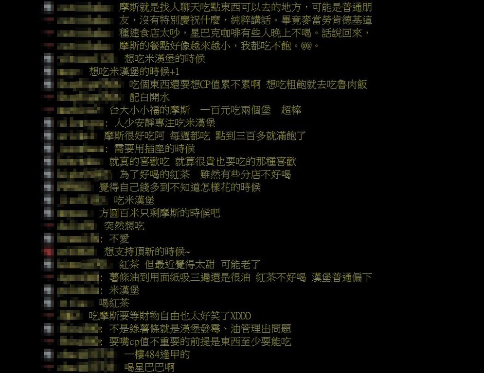 文章發出沒多久,就吸引許多喜歡吃摩斯的常客回覆,「想吃米漢堡的時候」、「人少安靜專注吃米漢堡」、「需要用插座的時候」、「為了好喝的紅茶」、「好吃~沒這麼餓的時候」、「想吃氛圍的時候」、「不餓的時候」。