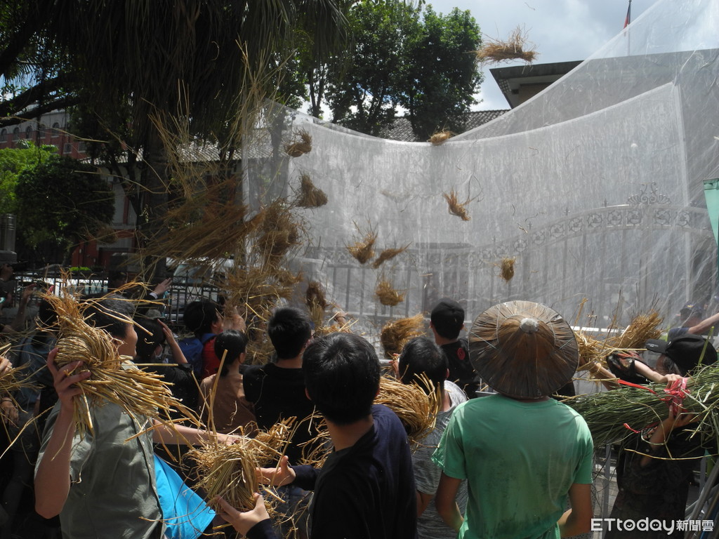 ▲環團當時不滿政府工輔法修正草案到立院丟稻草抗議。(圖/記者許展溢攝)