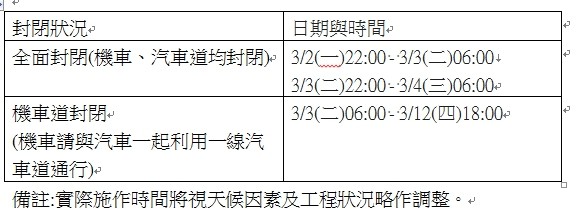 預計於3/2(一)晚上10點至3/3(二)早上6點及3/3(二)晚上10點至3/4(三)早上6點等兩個夜間時段進行全面封閉,嘉雄陸橋將不可通行,敬請市民朋友於夜間施工期間,利用興業地下道、北興陸橋或垂楊大橋改道通行。