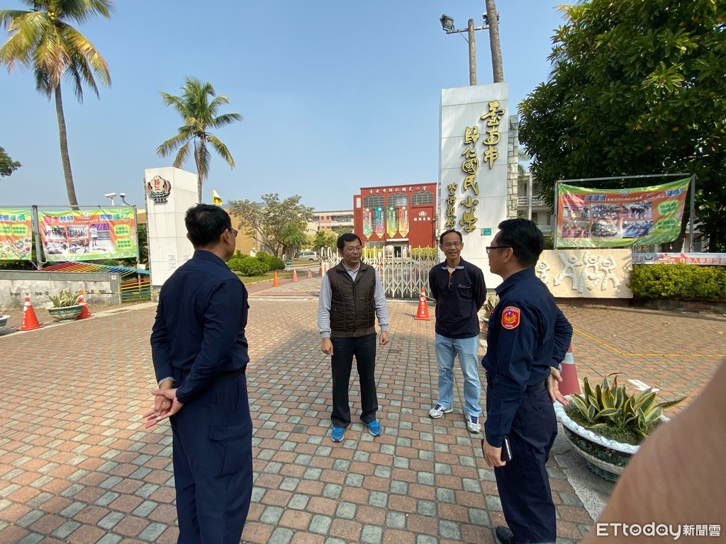 ▲歸仁警分局副分局長黃宗仁,率所長前往拜訪學校瞭解量測體溫動線及進校入口,以利規劃超前布署。(圖/記者林悅翻攝)