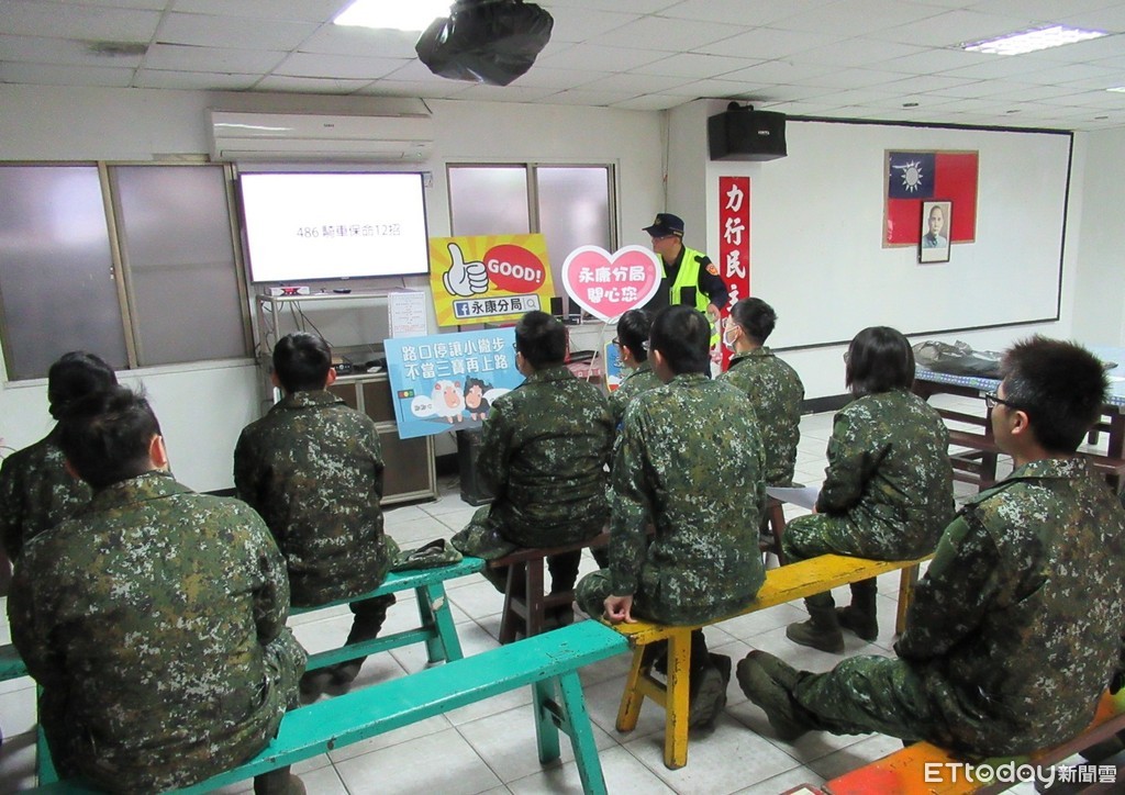 ▲台南市警永康分局,配合陸軍第四地區指揮部補給油料庫台南補給分庫,辦理交通宣導。(圖/記者林悅翻攝,下同)