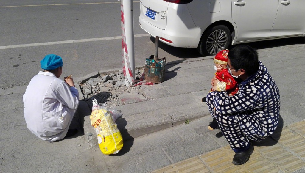 ▲江世娥和家人蹲在路邊吃飯。(圖/翻攝自新浪網)