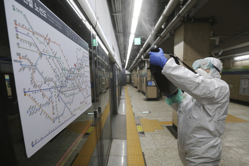 ▲ 防疫人員在大邱地鐵站內進行消毒。(圖/達志影像/美聯社)