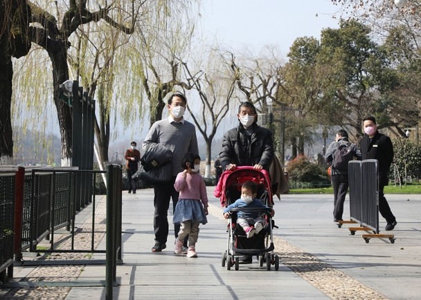 2月23、24日,大陸杭州著名的西湖景區,迎接周末首批遊客,並在各點的出入口處架設檢疫站點、限制遊客須戴口罩遊覽,據《中新社》等陸媒實地探查,景區客流量已經逐步恢復,包括杭州植物園半天進場人次超過2,000人,斷橋一天遊客量達5,100人次,有民眾更戴着口罩,與家人、親友在草地上野餐、嬉戲。