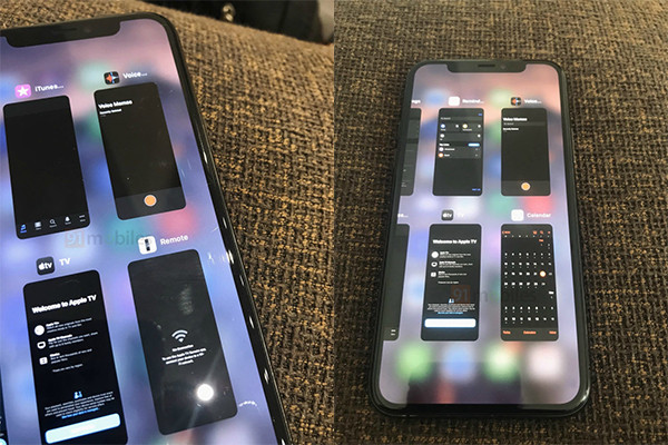 與當前iPhone X以上機款開啟多工是「從底部往上滑」的手勢不同,影片中可以看到,使用者是將「往下滑動」。而顯示出來的多工頁面則為方塊狀,一個畫面將顯示4款App,向右滑動可查看其它App。若用戶欲強制關閉App則同樣是將該App往上滑掉。