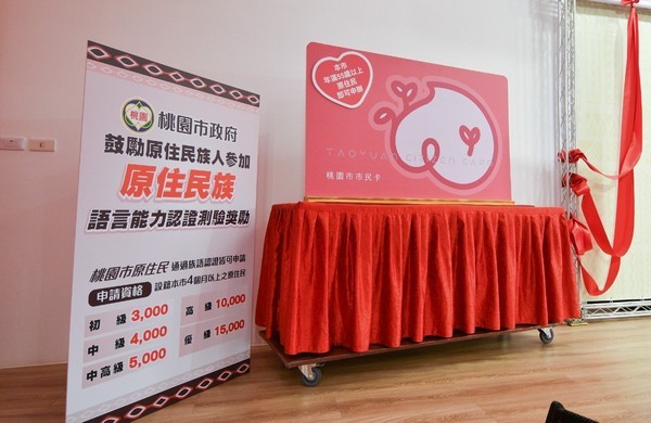 桃園除了率先實施原住民學生族語認證獎勵以外,今年更擴大獎勵對象,鼓勵所有本市原住民族人參加原住民族語言能力認證測驗,凡設籍本市4個月以上的原住民通過族語認證皆可申請初級3,000元、中級4,000元、中高級5,000元、高級10,000元、優級15,000元獎金,希望透過擴大獎勵方式,鼓勵報考認證,推廣原住民母語扎根。