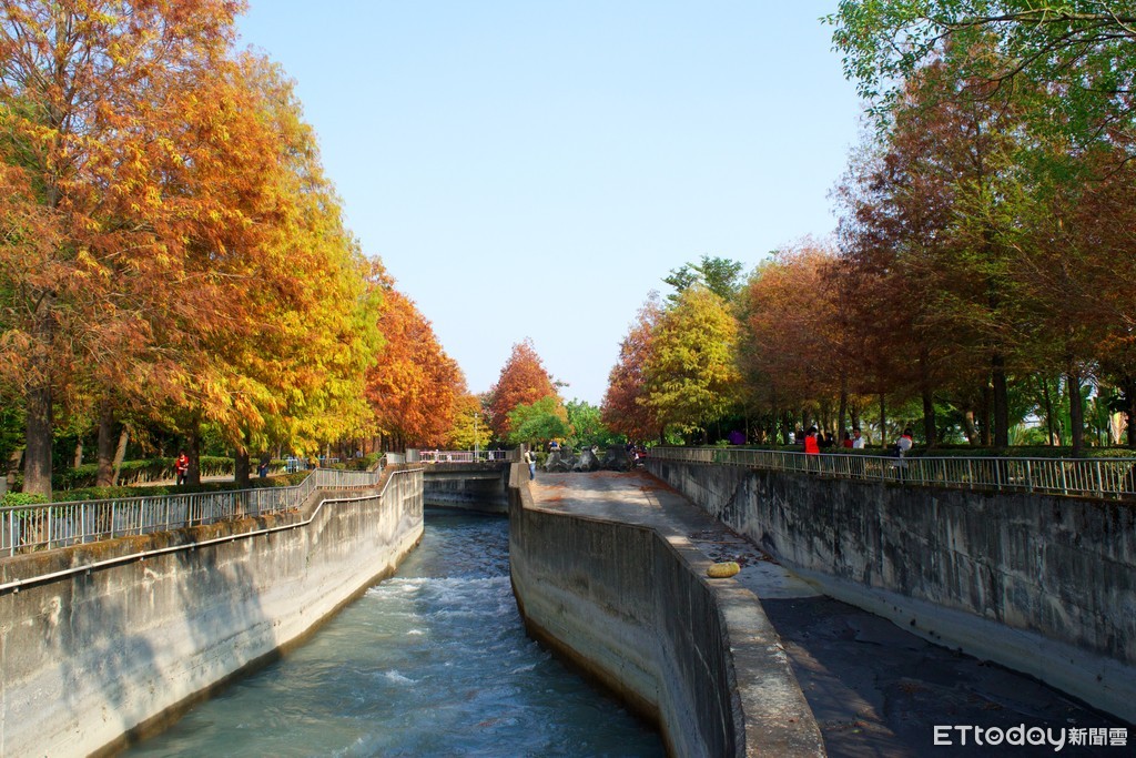 ▲農田水利文物陳列館旁水圳落羽松每到秋季就像在小歐洲。(圖/記者于佳云、陳涵茵、蔡玟君攝,以下同)