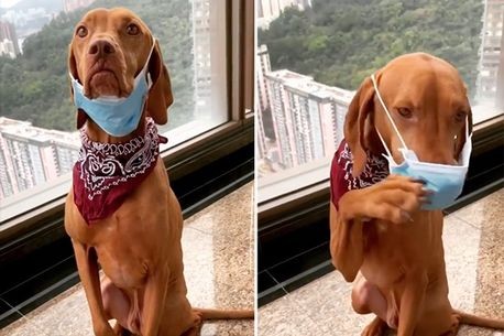 這是一隻棕色的Cooper-Hungarian Vizsla犬。從影片可以看見,脖子上圍著紅領巾的牠坐在窗邊,主人正在一本正經的告 訴牠防疫保命的重要。狗狗的耳朵後面掛著一個藍色的口罩,懸掛位置剛好在牠的嘴巴下方。