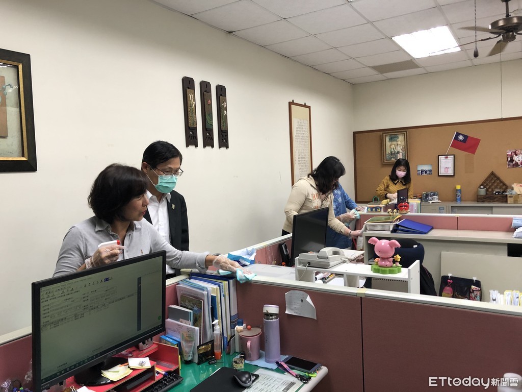 中華醫事科技大學2月25日開學,校園防疫消毒不馬虎,各處辦公室、公共場所均置放酒精噴液,電梯也定時加強消毒擦拭,校外人士進校需先通過額溫測試,各公共空間也發動教職員工以稀釋的漂白水擦拭清潔,曾信超校長帶領副校長孫逸民,上午逐一抽查各單位的防疫工作。