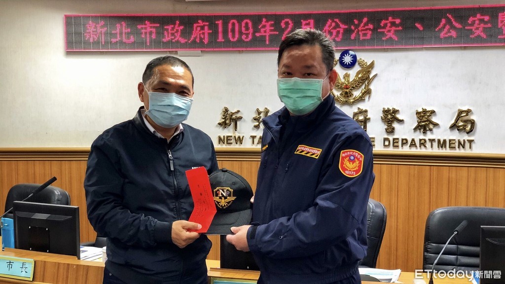 新北市長侯友宜25日出席2月份新北市治安會報,會議中特別頒獎表揚瑞芳警分局交通分隊小隊長謝明松、瑞芳區上天里里長林瑞明及汪姓公車司機,鼓勵主動積極及見義勇為事蹟。