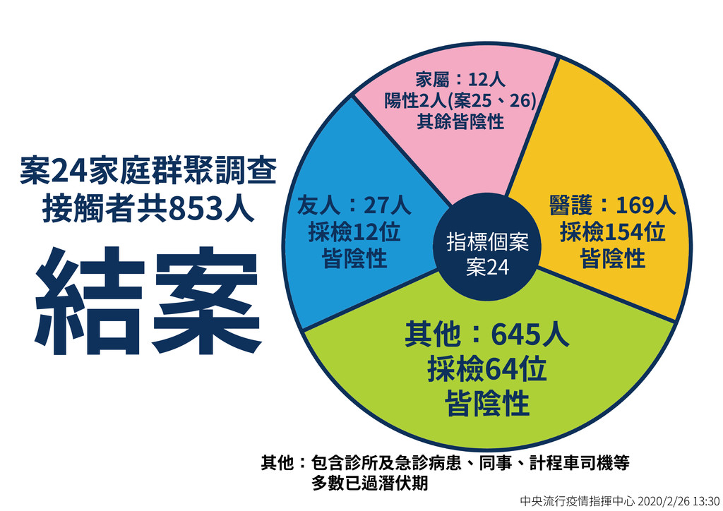 陳時中表示,總計掌握接觸者853人,其中12人為家屬,有2人陽性確診(案25、26),醫護169人採檢154人,友人27人採檢12人,其它接觸者645人採檢64人皆屬陰性;案24的感染源從資料分析不去強烈追蹤,因為可能案件都已經超過潛伏期,整體來說該案沒有向社會擴展之虞,故宣布結案。