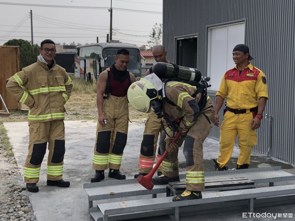 在烈日當頭下,4位猛男於消防局新化訓練中心體驗消防救援挑戰,除全副武裝穿著全套消防衣及空氣呼吸器外,還要負重攜帶水帶、瞄子等救災裝備登梯,模擬救災重度工作,並依靠繩索徒手上登及水平橫渡救助,結合體能與技能的挑戰,消防局希望透過健身猛男的網路影片,能讓更多人體會到消防救災的辛勞,進而尊重消防人員並珍惜救災資源。