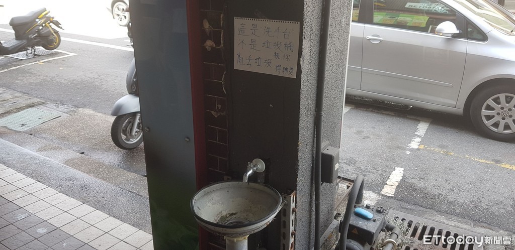 店家為方便清潔在騎樓設置洗手台,卻引來有沒公德心的人亂丟垃圾,以前也貼過告示但完全無效,沒想到這次貼公告嚇阻配上2月初新冠肺炎令人害怕,乾脆結合時事貼告示,效果出奇非常好。