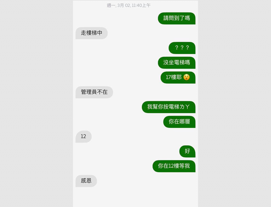 沒想到這一問不得了,原PO家住在大樓17樓,而這名外送員竟然因為管理員不在,外加原PO寫的備註,於是決定不打擾原PO,獨自一人爬樓梯爬到了12樓,直到原PO發現後,才幫外送員按電梯。