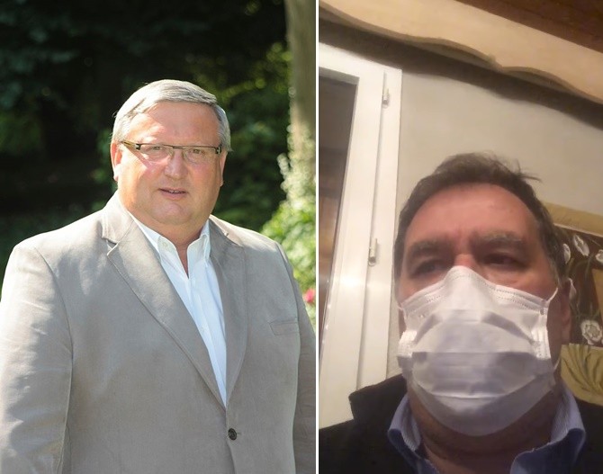 ▲法國瓦茲省克雷皮(Crépy-en-Valois)的市長福爾蒂(左)、上薩瓦省拉巴勒姆德西蘭吉(La-Balme-de-Sillingy)的市長戴維(右)分別宣布新冠肺炎篩檢結果呈陽性反應。(圖/翻攝Bruno Fortier、Francois Daviet臉書)